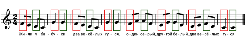 Давайте рассмотрим ноты этой песенки! Сильные доли отмечены красным цветом, слабые – зеленым цветом.