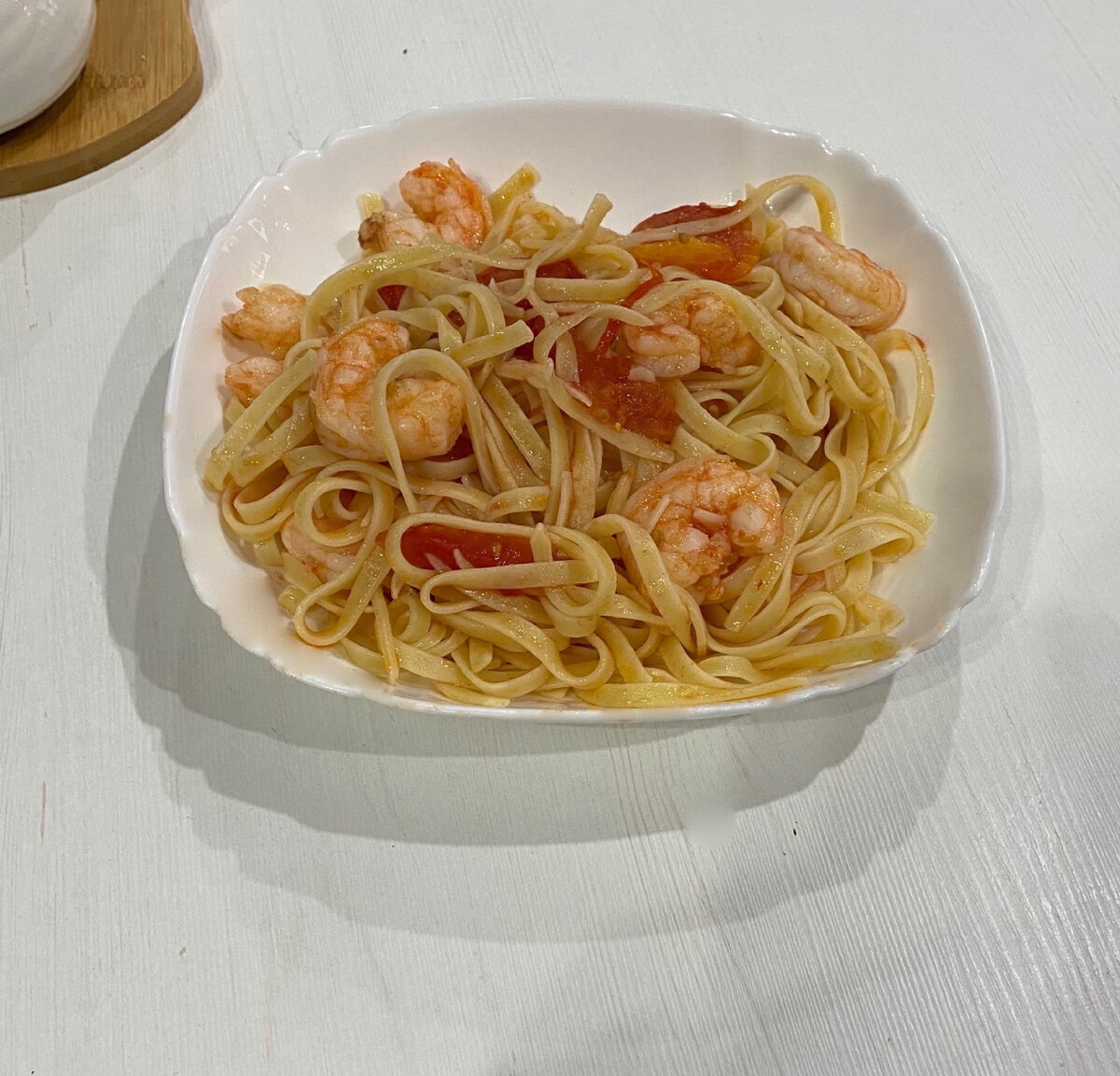 Ингредиенты:🛒 Макароны (лингвини)-250гр. Креветки (неочищенных) -400 гр. Чеснок-2 зубчика Оливковое масло- 20 гр. Помидоры черри (у меня был обычный помидор 1шт.) -100 гр. Лимонный сок-1 ст. ложка Соль- по вкусу Способ приготовления-🤩 1.В кастрюле доведите до кипения воду и немного подсолите. Опустите пасту в кипящую воду и варите согласно инструкции на упаковке. На это уйдет минут 10-15. Паста должна стать мягкой, но не развариться. С готовой пасты слейте горячую воду. 2.Отдельно разогрейте сковороду до горячего состояния и налейте на неё оливковое масло. Чеснок очистите от шелухи и мелко нарежьте. Выложите измельченный чеснок в сковороду и перемешайте его в горячем масле. 3.Следом отправьте в сковороду подготовленные очищенные креветки. Перемешайте и обжаривайте на сильном огне 2-3 минуты. 4.Затем сделайте огонь меньше и выложите в сковороду помидоры черри, разрезанные напополам. Подержите сковороду на огне еще в течение минуты и выключите огонь. 5.Готовую пасту выложите к кревет
