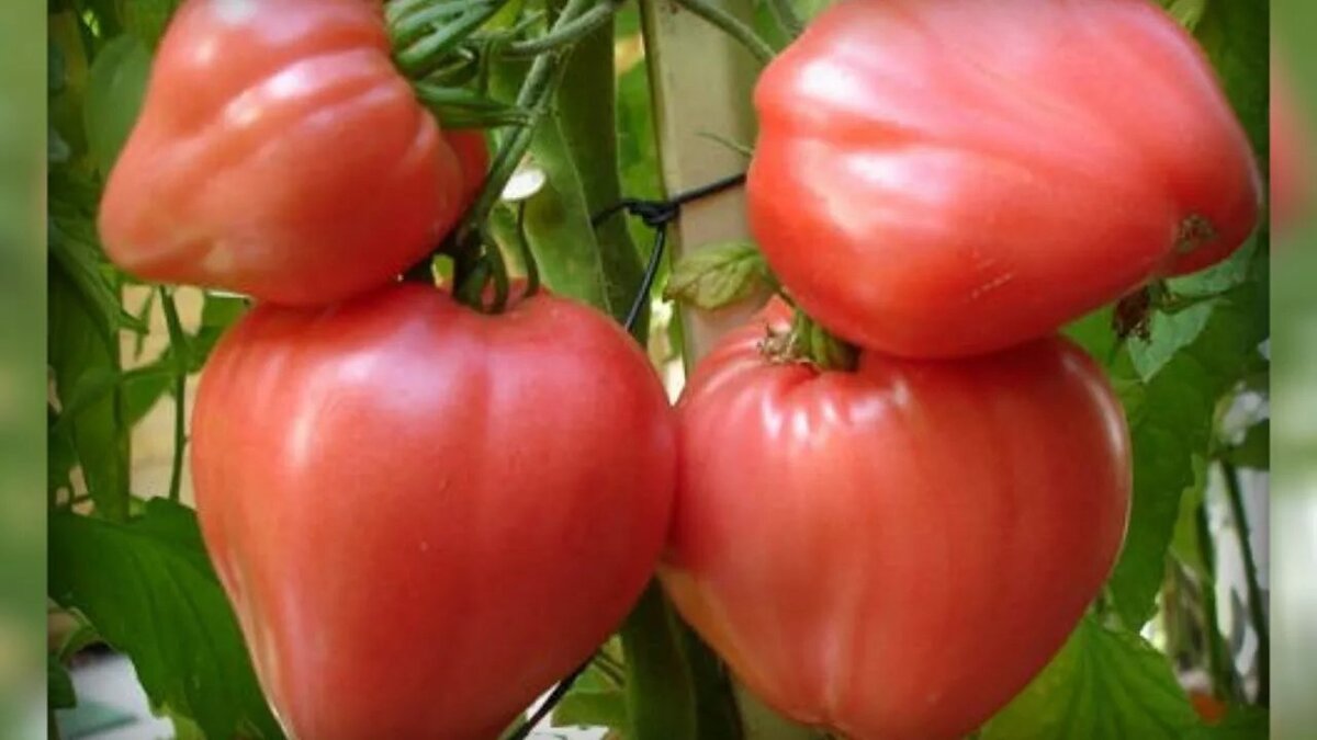 Один из самых популярных сортов с крупными плодами. Средняя масса достигает 300 г. Окраска малиновая с розоватым оттенком. Во вкусе в основном заметны сладкие тона, есть небольшая кислинка. Форма томатов отчасти похожа на сердце, поскольку плод состоит как будто из 2 половинок и имеет острую верхушку. Заметны слабо выраженные ребра.