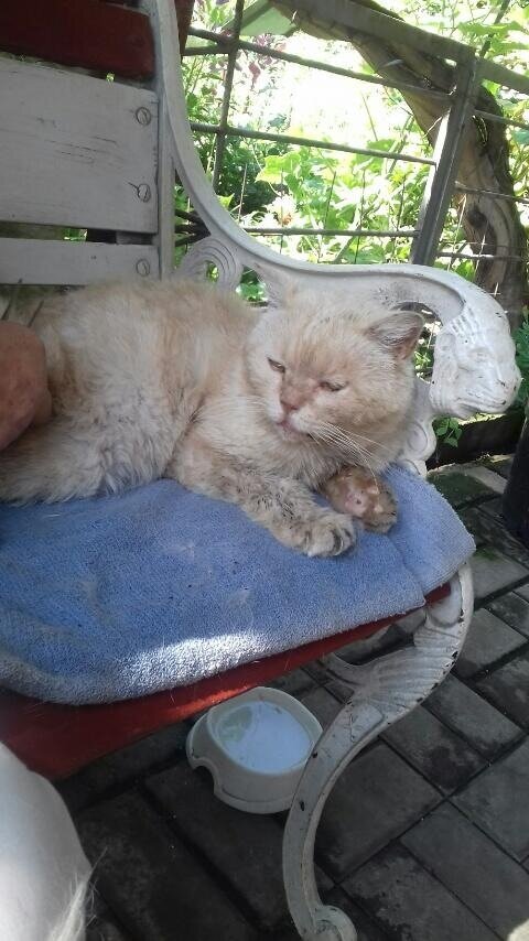 Худой, изнеможенный.....глядя на его длиннющее когти, которые закрутились в бублик, делаем вывод, что он был где-то закрыт и не имел возможности двигаться. Частный сектор...могли закрыть в сараях, чтобы ловил мышей. 😡😡😡