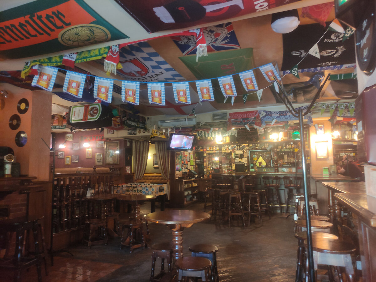 Сеть ирландских пабов "The Templet Bar" мы выбрали по отзывам и локации. На отдыхе традиционно хотелось попить холодного пива и вкусно поесть. К сожалению, в пивных барах/ресторанах ассортимент и качество блюд часто хромают. Сайт заведения маняще вещал про отменные блюда и свежее пиво. В Петербурге "The Templet Bar" сразу 5, мы выбрали тот, что располагался у метро Проспект Ветеранов. В соседнем здании с нашим отелем. В общем, в ирландском пабе мы провели довольно приятный вечер. Фото съеденного с кратким описанием следуют. Интерьер и меню Интерьер со вкусом, в спортивно-пивном стиле. Просторный зал с громадной барной стойкой и деревянной лаконичной мебелью. На стенах музыкальные пластинки и ретро картинки, потолок украшают гирлянды из пивных кружек и флаги футбольных клубов. В меню много мяса (от стейков до фирменных колбасок и, оправдывая позиционирование, свинины по-ирландски) и всевозможных закусок под пиво. Закуски разных кухонь: баварский брецель, балтийская килька, картофельные