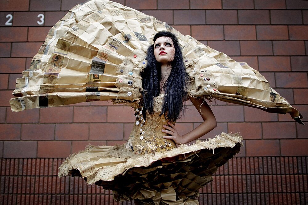 Для моды из вторсырья есть и свои конкурсы. Один из них - в Ирландии, модель демонстрирует платье из газет, пуговиц и бирок. Фото: GettyImages
