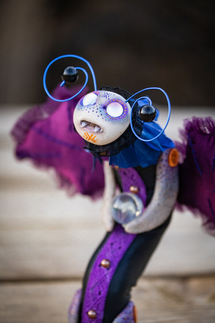Выполнен на заказ. Материалы: полимерная глина, стекло, акриловые краски, пастель, акриловый лак, проволока, шелк, фатин, перья, натуральная кожа, опилки, синтепон, кружево, бусины, деревянные пуговицы, мулине, черный халцедон. В мире много звёзд, и за всеми нужно ухаживать - зажигать вечером и гасить на рассвете, следить, чтобы каждая звезда занимала своё место, чинить сломанные звёзды, а те, которые никуда не годятся, заменять на новые. Для такого дела нужен знающий работник. Так появился Небесный Фонарщик. Ему столько же лет, сколько и первой звезде, появившейся на небосклоне. Столетиями бродит он под звёздным куполом, следя за порядком. Имя его в переводе с непальского значит "звезда". Недаром в Непале находится Эверест, самая высокая гора в мире, и оттуда лучше всего наблюдать за ночным небом. Создан в помощники для девочки, любящей всё необычное. Отныне они вместе будут ухаживать за звёздным небом. Во время звездопада даже можно услышать, как они тихонько смеются, наблюдая за сия