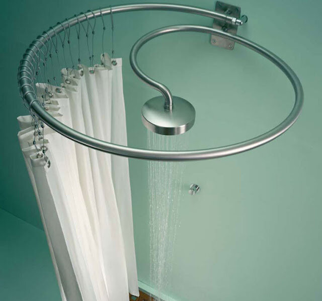 Наиболее распространены модели с применением матового алюминия, «нержавейки» и некоторых других металлов. Металлический карниз для шторки в ванной стоит значительно дороже. При покупке обращайте внимание на кольца. Если они металлические, то любое движение шторок будет сопровождаться повышенным шумом. Пластиковые кольца очень непрочные, поэтому оптимальный вариант – металл покрытый пластиком.
