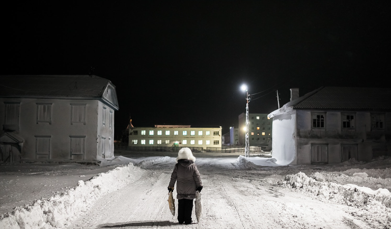 Вглубь все идет вперемешку – сараи, школа, лапы оленя, здание администрации, огромная надпись: «Таймыр за мир» и как финальный аккорд – обшитая сраной кровлей общага погранцов. Какие же ущербные рожи у военных ниже лейтенанта просто кошмар, я не знаю это везде так или только тут.