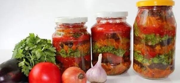 Очень яркая и очень аппетитная закуска! И при всех своих достоинствах на приготовление этого разноцветного чуда времени нужно совсем немного. Баклажаны мы будем не обжаривать, как обычно это делается, а запечем в духовке, поэтому они не наберут масла и не будут жирными. Пропорции в маринаде даны приблизительные. Вкусы у всех разные – кто-то любит покислее и поострее, а кто-то предпочитает овощные закуски сладковатые, не острые. Перед тем, как заливать маринад в баночки, попробуйте его на вкус, и добавьте то, что посчитаете нужным. Баклажаны по этому рецепту лучше делать в сентябре-октябре, когда уже начнет холодать. Тогда готовую закуску можно хранить на балконе, чтобы не занимать место в холодильнике. При прохладной погоде она хорошо хранится на балконе до весны. Если хотите именно закатать, чтобы хранить в кладовке, то нужно добавить больше уксуса и все хорошо простерилизовать – и крышки, и банки, и саму баночку с баклажанами. Для банки 0,5 л. время стерилизации – 30 минут, дл