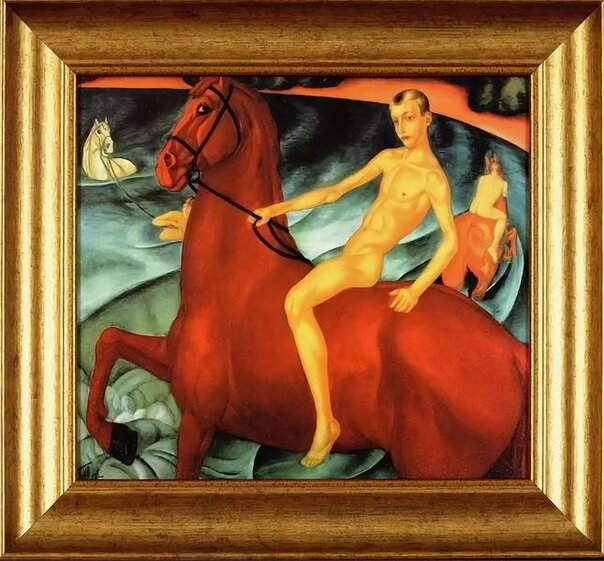 Вот на водоёме кони разной масти, И не просто кони, а из военной части! Они скакали долго и устали очень, Теперь жуют траву вдоль пыльных обочин. Вдруг раздаётся команда: “Купай коней!” И каждый конь становится в миг резвей! Бойцы сёдла наземь, одежду - рядом, И с лошадьми в воду, будто нарядом! В воде всадники быстрей по коням, Весёлые, голые, веселятся споря, Скачут в озеро - брызги в стороны! И улетают испуганно чёрные вороны! Кони купаются разных мастей, Голые парни кричат веселей! И вот он красивый конь красный, Купается в озере, он прекрасный! Он радуется, ржёт, веселится, И вода на крупу искрится! Всадник думает: “Конь боится, Чтоб ненароком не простудиться!” И увидел это купание художник, Он ходил рядом, собирал подорожник, И картину запомнил он эту, Не сказал ни друзьям, ни поэту, В мастерской он писал эту картину, Чтоб потом показать её всему миру, И удивить народ красным конём И голым всадником прямо на нём! И не важно, что думает зритель - Кон
