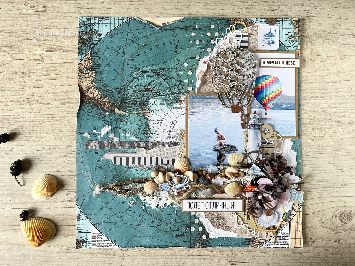 Добрый день, дорогие творческие! Здравствуйте! Сегодня вас рада приветствовать я, Оксана Салова. Поболтаем о скрап-страничках?) Вы знаете, я считаю, что этот жанр скрапбукинга просто создан для того, чтобы заскрапить тот самый Момент. Когда фотоальбома вроде как нет в планах, но есть фото, которое просто должно превратиться в шедевр!) Вот, например, фотографии нашей семьи, которые вы видите в этой работе. Это был очень памятный случай, когда мой сынок сидел на камне у воды, и недалеко "приводнился" самый настоящий воздушный шар!) - Ого! Полёт отличный! - завопил сын, и с тех самых пор просто грезит о небе!) Фотографии лежали распечатанные целый год. Пока не вышла коллекция "Фономикс. Карты". И глядя на эту коллекцию я даже улыбнулась - вот оно! Её будто специально создали для наших фото!) Скажу по секрету - это моя первая скрап-страничка). Спасибо нашим девочкам-дизайнерам, это был настоящий мозговой штурм! Ведь два глаза хорошо, а двенадцать - гораздо лучше, правда?) Немного о том, ка