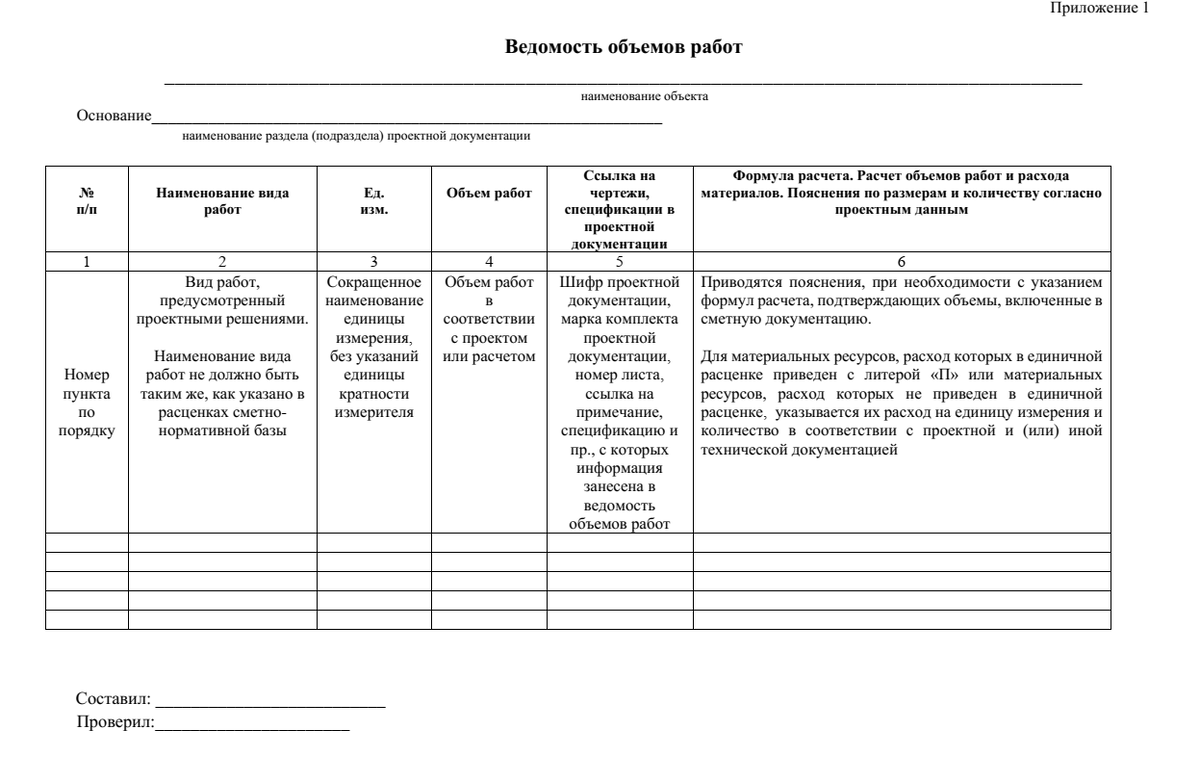1. Ведомость объемов работ выполняется по видам работ к каждому основному комплекту проектной документации, в соответствии с требованиями ГОСТ 21.109-80, т.е. просто выгрузка из сметной программы будет ошибочной. 2. В графе «Наименование вида работ» указывается вид работ, предусмотренный проектными решениями. Например: разборка кирпичной кладки, погрузка строительного мусора и т.д. 3. В графе «Ед. изм.» указывается сокращенное наименование единицы измерения. Например: 1 м2, 1 м3, 1 шт, 1 т, 1 кг т.д. В ведомости объемов не должны быть указаны единицы кратности измерения, такие как 100м3, 1000м2 и т.д. 4. В графе «Объем работ» - должен указываться объем работ без отрицательного значения. 5. В графе «Ссылка на чертежи, спецификации в проектной документации» указывается шифр проектной документации, марка комплекта проектной документации и номер листа, с которого информация занесена в ведомость объемов работ. Отсутствие ссылок на чертежи и спецификации, обосновывающие принятые объемы раб