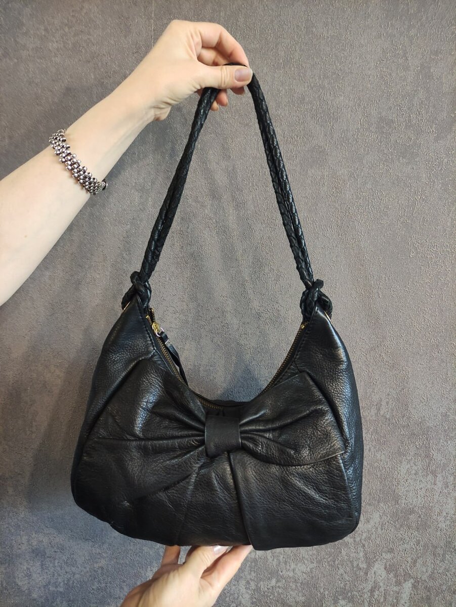 Красивая женственная модель с асимметричным кожаным бантом впереди, изысканно и стильно вписанным в дизайн сумки. Мягкая масленичная и тактильно приятная натуральная кожа. Роскошные плетеные ручки, завязанные на люверсах – красивая идея крепления без карабинов. Внутри – вместительн