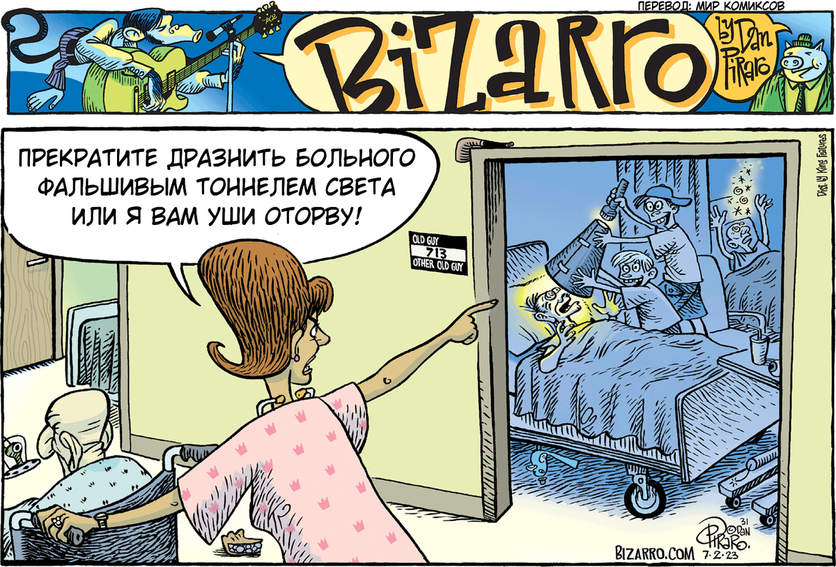 Среди комиксистов, как и среди людей, работающих в любой другой творческой сфере, есть настоящие убеленные сединами и увешанные наградами мэтры. Такие художники словно маяк, обозначают направление и служат примером для многих других Американский карикатурист Дэн Пираро (Dan Piraro) один из них, его можно отнести к живым классикам комиксов и карикатуры, так как она занимается рисованием смешных картинок уже почти 50 лет. Несмотря на возраст, а художнику уже 65, Дэн Пираро не закостенел, его рисунки нельзя назвать старомодными или неактуальными. Он рисует про жизнь, но делает это под таким сюрреалистичным соусом, что не сразу понятно, что все эти истории про нас с вами. Одна из самых популярных работ художника это серия комиксов Bizarro, которая выпускается с 1985 года. За прошедшие десятилетия комиксы обросли собственной историей и даже тайными знаками. На каждом комиксе можно найти предметы, которые имеют особое значение. Кортинка с предметами и их значением будет прикреплена в комм