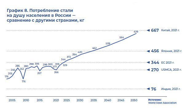 ⛏Потребление стали на душу населения в России к 2025 году обгонит текущий уровень ЕС и к 2050 году достигнет текущего уровня Китая — World Steel Association