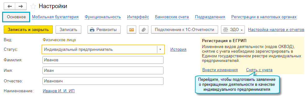 В программе 1С:Бухгалтерия 8 начиная с версии 3.0.138 добавлена возможность оформить и подать заявление о прекращении деятельности в качестве индивидуального предпринимателя.