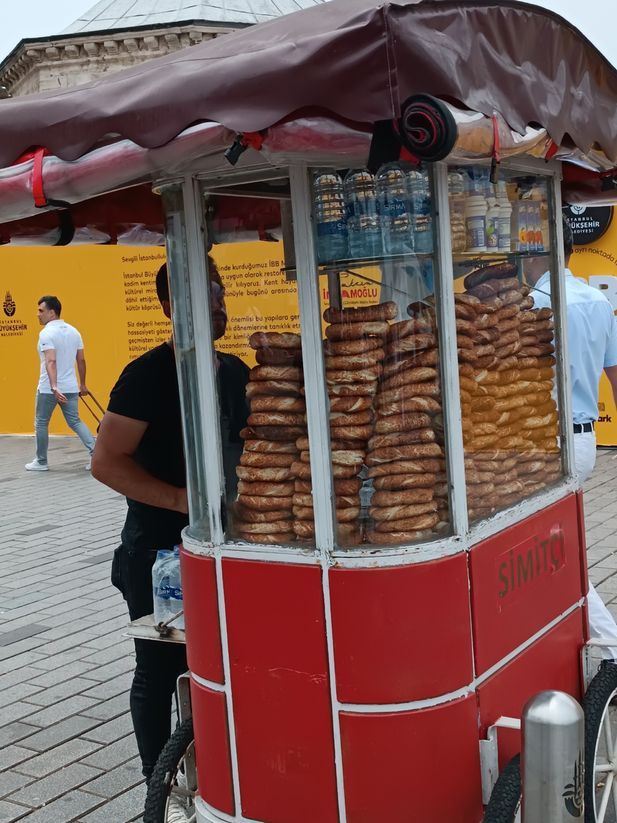 Симит (Simit) - это турецкий сдобный и посыпанный кунжутом калач, который продается везде и всюду. Национальная и самая известная турецкая еда, история которой насчитывает уже 600 лет. В четырнадцатом веке такие бублики появились на столе султана, а потом ушли в народ и стали главным блюдом и на улицах, и дома, и в путешествиях. В Стамбуле первый свой Симит мы попробовали на площади Таксим, купили вот в таком фирменном вагончике. И были разочаровны. Булик попался старый и сухой. Искрошили его потом чайкам на набережной. Потом нам принесли кусочки Симита в хлебной корзине в кафе. И вот там мы с удовольствием макали этими кусочками в соус, булочки были свежими и ароматными. А самый вкусный Симит мы ели в аэропорту Стамбула, уже внутри, в зоне посадки, когда прошли все досмотры и контроли. Вот там взяли по свежему, еще горячему калачу с кунжутом и по бутылочке колы. Очень вкусно, хоть и не полезно ******************** Всем успехов! ***************** Конечно приглашаю и в мои группы в ВК: