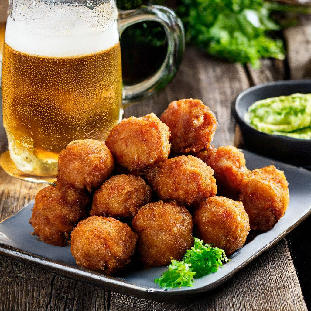 для фарша Для начинки и панировки Лепим фрикадельки грамм по 30, во внутрь вставляем кубик сыра, панируем в муке, потом в яйце, потом в чипсах, все хорошо прижимаем. Жарим во фритюре до золотистости, далее в духовку на 180 градусов 15 мин. Готово.