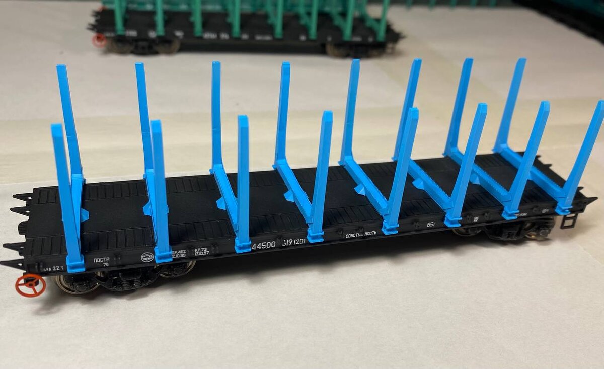 Модель вагона для перевозки леса 13-4012 со стойками-кониками. Выполнена из набора для самостоятельной сборки производства 3D maker Ekb (платформа) с дополнением стоек из набора производства Павла Самолётова. Данная модель была выполнена одновременно с еще двумя моделями похожих лесовозов, выполненных из китов от 3D maker Ekb, Modela, и опубликованных на канале ранее. Как и две опубликованные ранее модели эта также была выполнена в базовой версии набора с небольшими доработками: добавлены стойки, сделанные из смолы и фототравления, колесные пары Evemodel, сцепки типа "накидная петля" под NEM-шахту, лестницы и поручни из латунной проволоки. Для окраски была выбрана необычная схема: черная платформа с синими кониками. Такая схема окраски выглядит, безусловно, интереснее, но существенно усложняет сборку модели. Платформа и коники окрашиваются отдельно, и уже после покраски модель собирается окончательно. С учетом того, что коники состоят из множества деталей (одна стойка - это одна детал