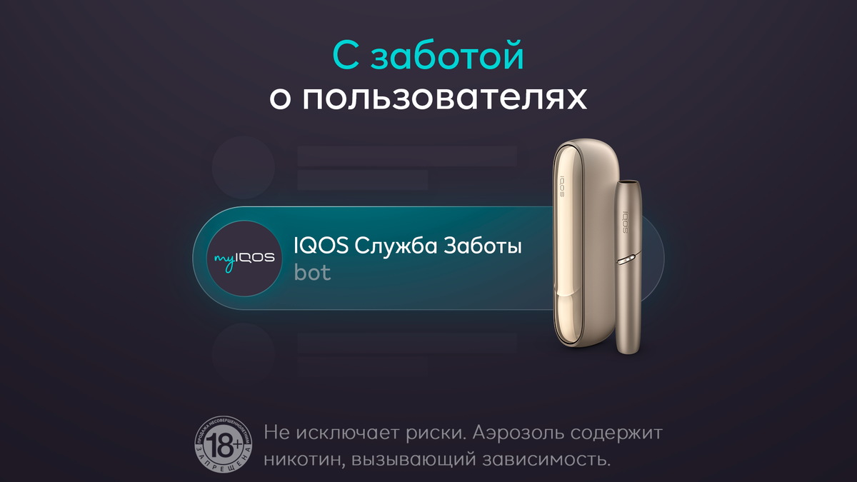 Появились вопросы по использованию IQOS или lil SOLID? Чат-бот Службы Заботы IQOS в Telegram поможет вам найти ответы на ваши вопросы об устройстве. Покупка и обслуживание устройства Чат-бот поможет оформить заявку на покупку устройства, узнать адреса ближайших фирменных магазинов Q STORE и статус вашего заказа. Бот сам подберет ближайшие к вам магазины с необходимым сервисом: аренда, покупка, диагностика и профессиональная чистка устройства. «Мои устройства» Раздел управления вашим IQOS или lil SOLID. Там вы можете увидеть все свои устройства и, при необходимости, добавить новое. По каждому из них доступно меню, в котором вы найдете советы по использованию, условия гарантии и узнаете о том, как устранить неполадку. Видеозвонки и чат с оператором Наши специалисты всегда рады помочь найти ответ на любой вопрос. Для этого вы можете использовать не только автоматизированный функционал бота, но и связаться со специалистом лично в том формате, который будет удобен именно вам. Служба Заботы
