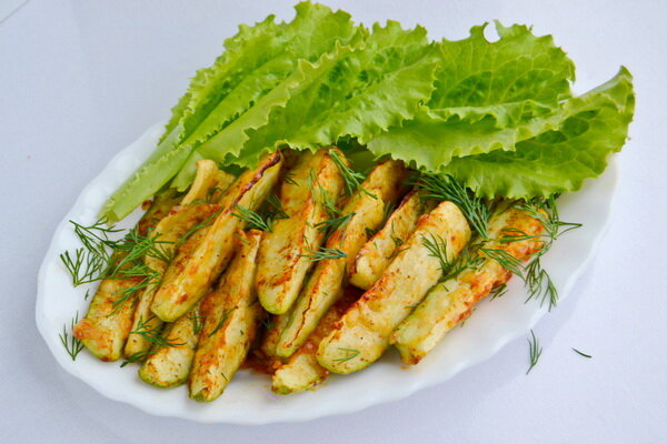 Предлагаю удачный и простой рецепт приготовления вкусных кабачков, запечённых в духовке под золотистой сырной корочкой. Этот рецепт удачен тем, что не нужно стоять у плиты и жарить кабачки. Готовятся они быстро и просто. Мы запечём их в духовке брусочками, по вкусу кабачки получаются даже вкуснее обжаренных на сковороде. Ингредиенты: Приготовление: Для этого блюда берём молоденькие кабачки с нежной кожурой и мелкими семенами. С таких кабачков не нужно снимать кожуру, достаточно лишь вымыть. Далее нарезаем кабачки брусочками так, как показано на фото. Поместив брусочки кабачков в миску, поливаем их оливковым маслом. Перемешиваем ломтики кабачков, чтобы масло равномерно покрыло овощи. Добавляем соль. Посыпаем кабачки смесью перцев и сладкой паприкой. Добавляем сушеный молотый чеснок. Натираем сыр на тёрке со средними ячейками. Каждый ломтик кабачка посыпаем небольшим количеством сырной стружки. Теперь ломтики кабачков выкладываем на решётку. Отправляем кабачки на решётке в разогретую до