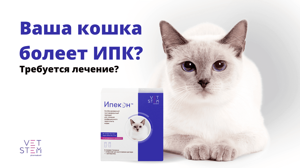 Дорогие коллеги и владельцы кошек! Рады представить Вам новый оригинальный препарат Ипекон® - первый российский препарат для лечения инфекционного перитонита кошек. Ипекон® — это первый истинный комбинированный противовирусный препарат, нуклеотидный ингибитор РНК-полимеразы вируса инфекционного перитонита кошек. Выпускается в форме лиофилизата для приготовления раствора для подкожного введения в комплекте с растворителем. Содержит два действующих вещества: Ипекон® прошёл все необходимые доклинические исследования, доказывающие его эффективность и безопасность применения. В настоящий момент препарат находится на стадии клинических исследований на кошках. Преимущества: Владельцам кошек: У Вашей кошки подозрение на инфекционный перитонит кошек? Компания ООО "ВЕТСТЕМ", в рамках действующих открытых клинических исследований, готова предоставить Вашей кошке препарат Ипекон® на весь курс лечения от инфекционного перитонита кошек. Лечение осуществляется на базе нескольких московских клиник.