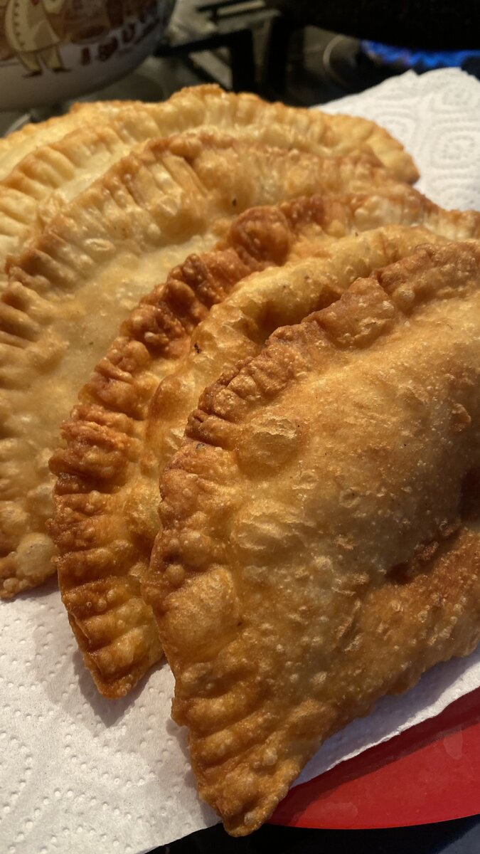 Тесто для чебуреков 1 яйцо 2 ч. ложка соли 6 ст. ложки муки 1 ст. ложка растительного масла 2 ст. ложка кипятка Оставить отдыхать на полчаса 2. В фарш добавить соль, перец и пучок зелени ( кинзу, петрушку), добавить мелкорубленный лук и измельченный зубчик чеснока 3. Тесто немного размять, сделать из него «колбаску» и разделить на порционные кусочки 4 . Раскатать кусочки и обрезать лишнее по тарелке На одну половину выложить фарш и немного тертого сыра Накрыть второй половиной и закрепить края вилкой Обжаривать в сковородке с большим количеством масла. Подавать лучше со сметаной или томатным соусом. Приятного аппетита ❤️❤️❤️