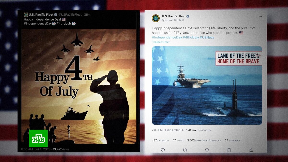 [ Смотреть видео на сайте НТВ ] Военно-морские силы США поздравили американцев с Днем независимости, опубликовав открытку с российским Су-27. На официальной странице Тихоокеанского флота в соцсети разместили фотоколлаж, на котором пехотинцы отдают воинское приветствие морякам и летчикам. Только вот истребители почему-то имели очертания российских Су-27, а судно напоминало советский противолодочный корабль. В комментариях американцы стали спрашивать, не пора ли им вместо звездно-полосатого флага США покупать триколор и разучивать гимн России. После волны насмешек картинку заменили на беспроигрышное изображение авианосца. Комментировать свою оплошность представители Тихоокеанского флота США отказались. [ Смотреть видео на сайте НТВ ]