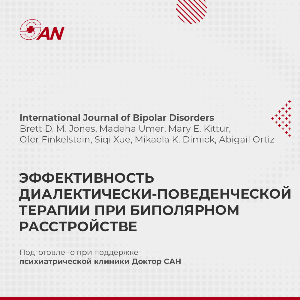 Диалектическая поведенческая терапия (ДПТ) может быть нацелена на несколько распространенных симптомов БАР. В систематическом обзоре оценивалась эффективность ДПТ при аффективных симптомах у пациентов с БАР. ДПТ может быть эффективным средством лечения БАР; однако уверенность в этом выводе ограничена небольшими размерами выборки, гетерогенностью и высоким риском систематической ошибки во всех опубликованных исследованиях. В настоящее время требуются более крупные хорошо спланированные РКИ, чтобы установить эффективность ДПТ при БАР. Подробнее о лечении БАР: https://doctorsan.ru/lechenie-bipolyarnogo-rasstroystva
