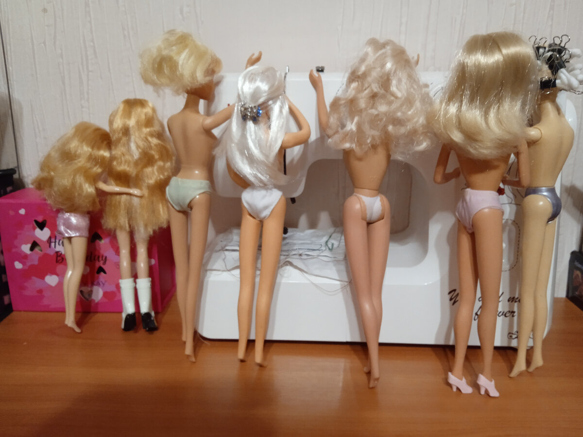 В одной из публикаций я показала фото своих стареньких куколок повернувшихся спиной к зрителю. Потому что были не готовы. Они долго лежали в коробках, кто-то был в старенькой не своей одежде, а кто-то не мытый и лысый. Сегодня часть этих винтажных кукол счастливо улыбается! Такими они были. Первые две малышки подростки ещё не готовы (с ними не хватает ещё двух). А вот взрослые девочки в том же порядке, как стоят спиной, показали свои лица и новые платьица. И так первая (не знаю названия, молд, кто создатель, словом - ничего про неё знаю) - ручки не гнутся, а ножки на два щелчка. Волосы не густые, но прошивка полная. Волосы завиты в кудри, не выпрямились даже после кипятка, и длиной чуть ниже плеч. Куколка эта купалась в ванной, причесывалась. И теперь предстала в образе милашки с бантиком. Вторая куколка, как мне уже подсказали, Санди. Я не помню, когда она появилась у меня. Она долго была в удмуртском национальном костюме и я даже забыла, а главное почему, она была лысая. Волосы б