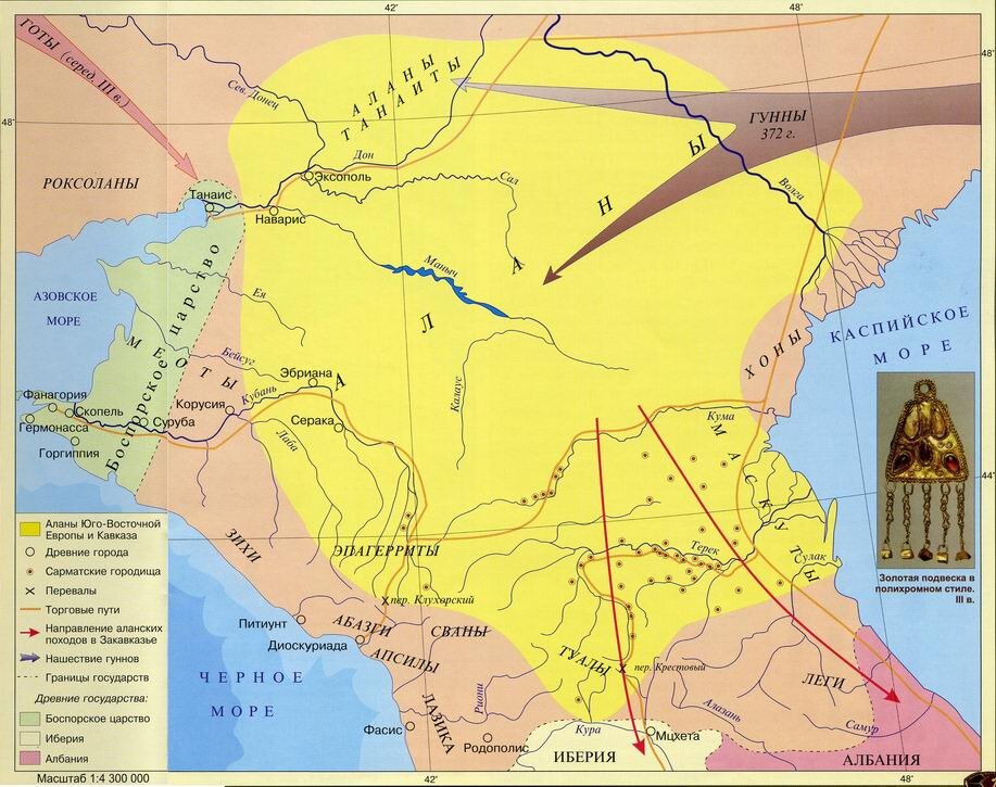 В III веке н.э. в скифо-сарматское царство вторглись готы, а через столетие пришли гунны, которые вовлекли местные племена в Великое переселение народов. Но слабеющее скифо-сарматское сообщество не растворилось в этом бурном потоке. Из него выделились энергичные аланы, часть которых вместе с гуннскими всадниками отправилась на Запад и дошла вплоть до Испании. Другая часть переместилась к предгорьям Кавказа, где соединившись с местными этносами, положила начало будущему раннефеодальному государству Алания.