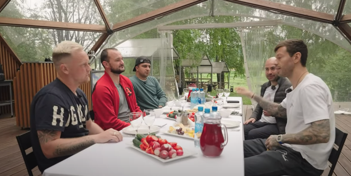 Компания болтала за одним столом в Подмосковье. На видео пили пиво, Смолов употреблял воду и кофе.