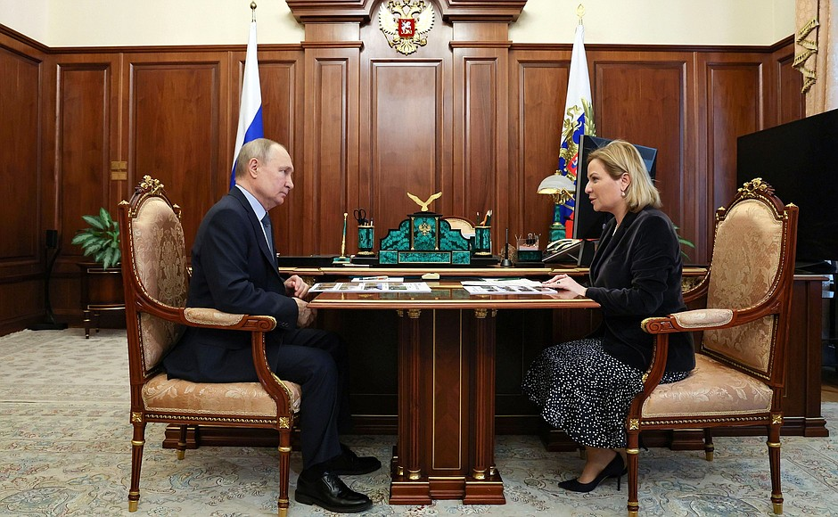 Владимир Путин провёл рабочую встречу с главой Министерства культуры Ольгой Любимовой. Обсуждалась, в частности, реализация реставрационных проектов в ряде субъектов Федерации, а также работа ведомства с новыми регионами. Фрагмент разговора В.Путин: Это очень важно. Не менее важно восстанавливать саму материальную базу. Я уже говорил. К сожалению, я не имел возможности посмотреть социальные объекты, когда был в Херсонской области, в Луганской [Народной Республике]. Но было видно, что там, где нет боевых действий, где более или менее стабильно, всё чистенько, убрано. Но конечно, сами учреждения – из машины много не увидишь, из вертолёта, – сами учреждения, я знаю, нуждаются в поддержке, в реставрации, в восстановлении на современном уровне – так, как у нас во многих местах делается в России. О.Любимова: Для нас очень дорого, что есть такая возможность. Вы знаете, в музеях, в библиотеках: каждый федеральный музей становится шефом новых регионов, у 995 библиотек там – шесть федеральных б