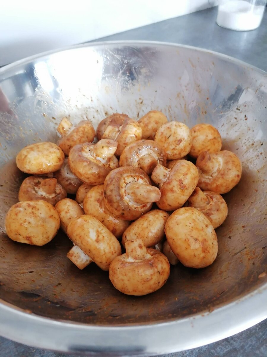 грибы шампиньоны, копченая паприка, смесь перцев, укроп, соль и оливковое масло.