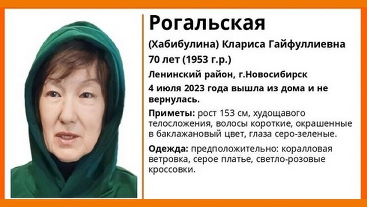В Ленинском районе Новосибирска благополучно завершились поиски 70-летней Кларисы Рогальской (Хабибулиной), которая 4 июля 2023 года вышла из дома и не вернулась. Женщину нашли живой и невредимой. Об этом сообщили волонтеры поисково-спасательного отряда «ЛизаАлерт» в социальной сети «ВКонтакте». «Найдена, жива! Спасибо всем, кто принимал участие в поиске, выполнял автономные задачи, распространял информацию в сети и делал репосты. Отдельное спасибо Владиславу, который не остался равнодушным и передал информацию о местонахождении пропавшей на номер инфорга», – отметили в отряде. Ранее «Вести Новосибирск» рассказывали, что полицейские и волонтеры ищут пропавшего без вести длинноволосого 24-летнего томича в очках. Его местонахождение неизвестно с 30 июня.