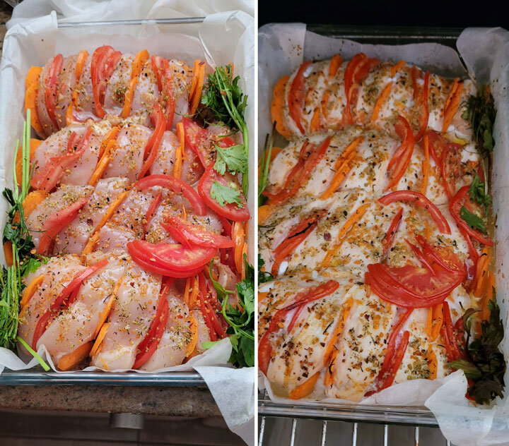 Куриную грудку посыпать любимыми специями, посолить гималайской или простой солью, сбрызнуть оливковым маслом, и дать постоять ночь. Сделав надрезы, «прослоить» морковью и помидором. Можно кабачком. Выложить в форму. Запечь. Сначала закрыв фольгой, 200 градусов, 20 минут. Снять фольгу, и ещё 10 минут. Выключить духовку, дать постоять20-30 минут. Готово! От наших друзей: Катя Лель, певица, автор песен, на Радио Медиаметрикс Больше общения и рецептов - в группе "Рецепты для диабетиков" в ВКонтакте! Рецепт на странице Автор рецепта – Oksana Derevianko