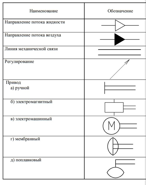 Графические обозначения направления потока жидкости, воздуха, линии механической связи, регулирования, элементов привода