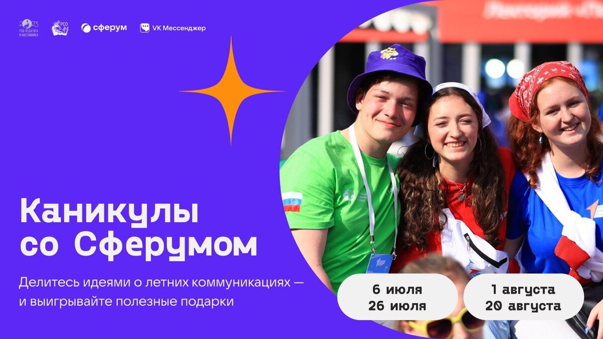 Образовательный сервис Сферум при поддержке Министерства просвещения РФ и молодежной общероссийской общественной организации «Российские Студенческие Отряды» запускает всероссийский творческий конкурс «Каникулы со Сферумом». Конкурс проводится в рамках Года педагога и наставника. Сервис приглашает поделиться своими идеями о том, как разнообразить общение, развить собственный блог или организовать событие в лагере, летнем кружке с помощью возможностей и функций учебного профиля Сферум в VK Мессенджере. Конкурс пройдет в два этапа: с 6 по 26 июля и с 1 по 20 августа 2023 года. В нем смогут принять участие дети и подростки в возрасте от 6 до 17 лет, а также: вожатые, педагоги дополнительного образования, руководители творческих кружков, спортивные инструкторы, психологи и организаторы летнего оздоровительного досуга, в частности руководители смены и программные директора. В рамках конкурса «Каникулы со Сферумом» детям предлагается придумать свой медиапроект для летнего общения, например,