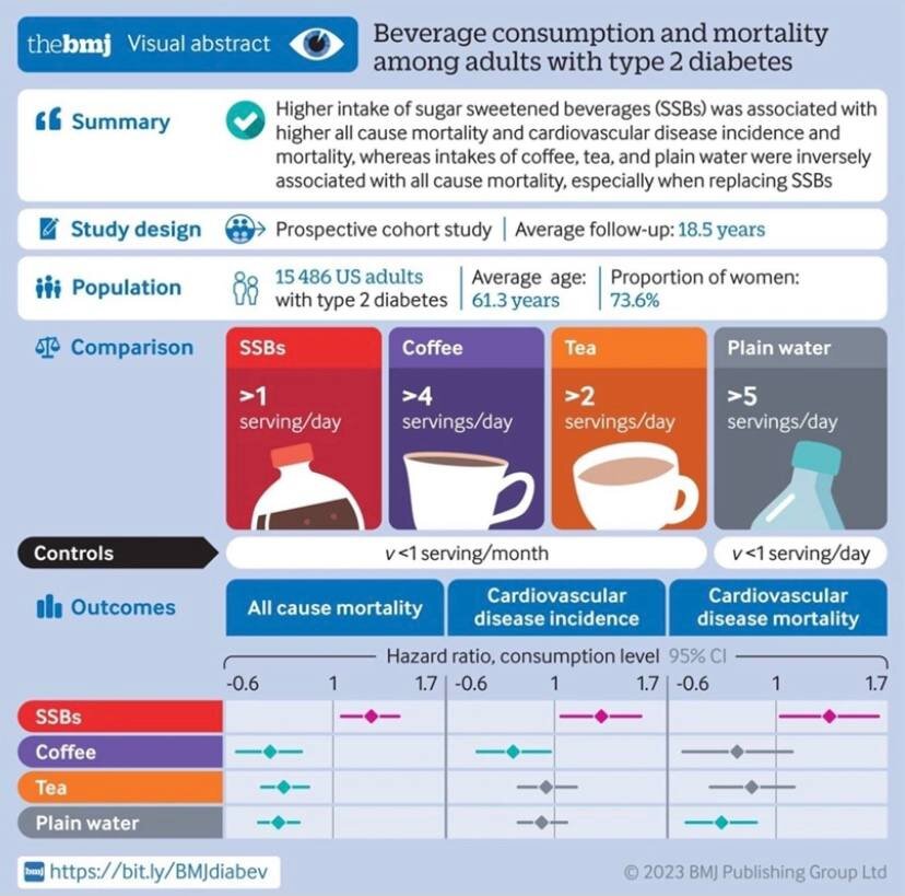 Вышла работа по изучению потребления определенных видов напитков и их связи со смертностью и исходами сердечно-сосудистых заболеваний среди взрослых с диабетом 2 типа. Участники 15 486 мужчин и женщин (медицинских работников) с диагнозом диабета 2 типа на исходном уровне и во время последующего наблюдения (исследование здоровья медсестер: 1980–2018 гг.; и последующее исследование медицинских работников: 1986–2018 гг.). Потребление напитков оценивали с помощью утвержденного опросника частоты приема пищи, который обновлялся каждые два-четыре года. Критерии основных результатов Основным результатом была смертность от всех причин. Вторичными исходами были частота сердечно-сосудистых заболеваний и смертность. Результаты В среднем за 18,5 лет наблюдения было зарегистрировано 3447 (22,3%) участников с сердечно-сосудистыми заболеваниями и 7638 (49,3%) смертей. После многопараметрической корректировки при сравнении категорий наименьшего потребления напитков с наибольшим потреблением объе