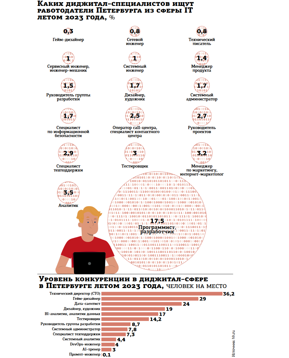 По данным hh.ru, с начала лета петербургским работодателям потребовалось более 120 тыс. новых работников. На долю диджитал–специалистов приходится 7%, или почти 9 тыс. вакансий. В топ самых востребованных кроме разработчиков и программистов входят аналитики (на них приходится 3,5% вакансий), маркетологи, тестировщики, а также специалисты техподдержки и руководители проектов. При этом в списке вакансий, публикуемых IT–компаниями, есть "новички": AI–тренер и промпт–инженер (нейросетолог), — на которые уровень конкуренции пока очень низок.