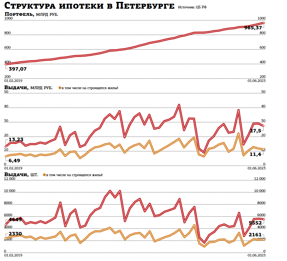 В Петербурге в январе–мае 2023 года, по данным Центрального банка, выдано 23,6 тыс. ипотечных кредитов. Это всего на 0,7% больше, чем за аналогичный период прошлого года, когда было оформлено 23,4 тыс. ипотек. При этом в деньгах рынок вырос сразу на 10%: в текущем году банками на покупку жилья предоставлено 121 млрд рублей по сравнению со 110 млрд годом ранее. В итоге общая задолженность по ипотеке жителей города достигла 965 млрд рублей, увеличившись с начала года на 7%, или на 17% в годовом выражении.