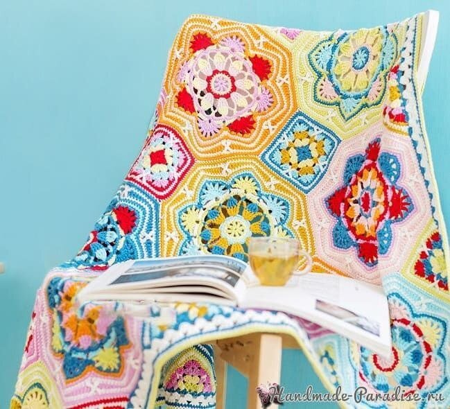 Плёд с узором "персидский ковер" выглядит как настоящее произведение искусства. Связан из различных оттенков пряжи, которые хорошо сочетаются между собой. Основной мотив на схеме обозначен буквой В. Самый большой и смена цвета происходит в каждом ряду. Понадобится 16 штук. Квадрат на схеме обозначен буквой А. Понадобится 9 штук. Большой треугольник обозначен буквой C и понадобится таких 12 штук. Малый треугольник D и таких нужно всего 4 шт. Обвязка пледа простая, он и без этого очень сложный Если вам понравилась эта статья оставьте свой комментарий. Магазин пряжи ВЯЗАНЫЙ.РФ
