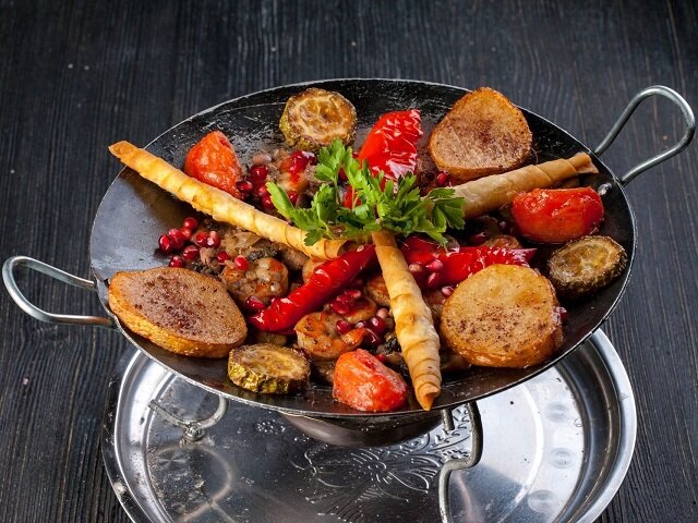 Также в этом разделе вы найдете подставки под саджи. Они не только декоративные, но и практичные: при подаче на стол в подставке можно разместить маленькую свечу, угли или мармитное топливо, они будут поддерживать готовое блюдо горячим. Эта функция особенно важна для традиционных блюд с бараниной, которая быстро остывает. Сковорода на кованой платформе с тлеющими углями очень эффектно выглядит на столе.