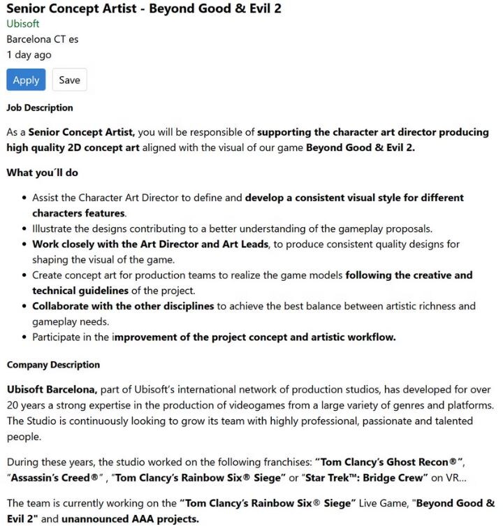 Студия Ubisoft объявила о поиске человека на должность художника концепт-артов, которому предстоит создавать изображения и графику для Beyond Good and Evil 2. Случилось это спустя 6 лет после того, как компания официально приступила к работе над проектом.