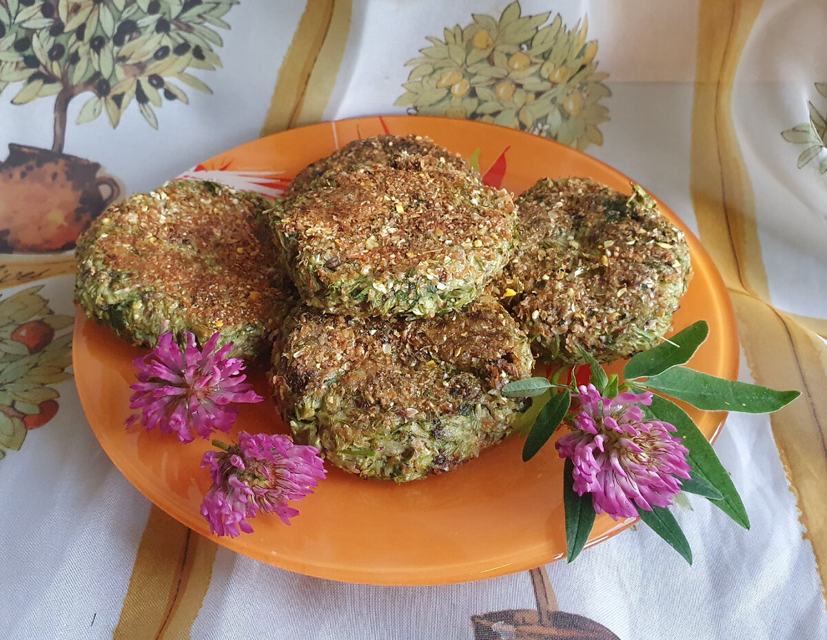 Сначала я сварила густую манную кашу. Залила манную крупу водой комнатной температуры, перемешала и оставила набухнуть минут 30. Затем довела смесь до кипения, постоянно помешивая, сняла с огня и укутала минут на 20-30. Немного остывшую кашу (чтобы яйцо не заварилось), смешала с яйцом и специями. Из специй я использовала порошок чеснока, сушеный лук, цветки лаванды (их зря), черный перец, семена укропа. Добавила предварительно измельченные в блендере цветки клевера. Не пугайтесь большого количества клевера: масса значительно уменьшится при смалывании.