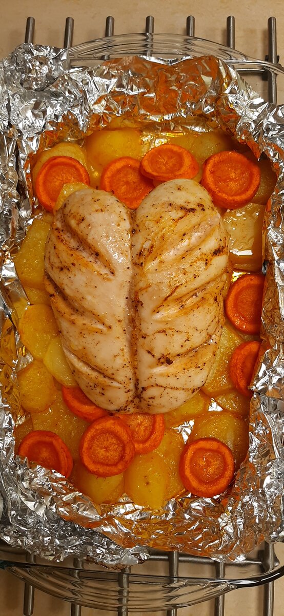 Всем привет! Я уже писала, что не люблю сложные рецепты. Поэтому всегда ищу быстрые, не "замороченные", и вкусные блюда, благо на просторах интернета их предостаточно. В этот раз делюсь рецептом обеда. Ингредиенты: По граммовкам смотрите сами, чтобы все уместилось в противень. Приготовление Я беру глубокую тарелку, наливаю растительное масло, в растительное масло добавляю специи и соль , чтобы специи "раскрылись". Далее обмазываю этими специями куриную грудку, перед этим делаю разрезы на грудке. Картофель и морковь нарезаю кружочками и в этих же специях обваливаю. На дно противня (у меня стеклянная форма; кстати, куплена в магазине "Светофор") стелим фольгу, выкладываем овощи и сверху курицу. Фольгу плотно запечатываем. Разогреваем духовку до 180 гр, выбираем режим "верх-низ" и готовим наше блюдо 1 час. Далее раскрываем фольгу и выпекаем еще минут 30 при 220 гр, один раз можно открыть и полить немного растительным маслом курицу. Можно переключить на гриль в конце готовки. Но смотрим