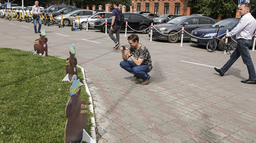 Аналогичное объявление появилось и на digital-экране на улице Карла Либкнехта. Там капибара просит «помочь Гале с отменой», а на улице Хохрякова, около БЦ «Палладиум», пасется целая стайка картонных травоядных с утками на голове.