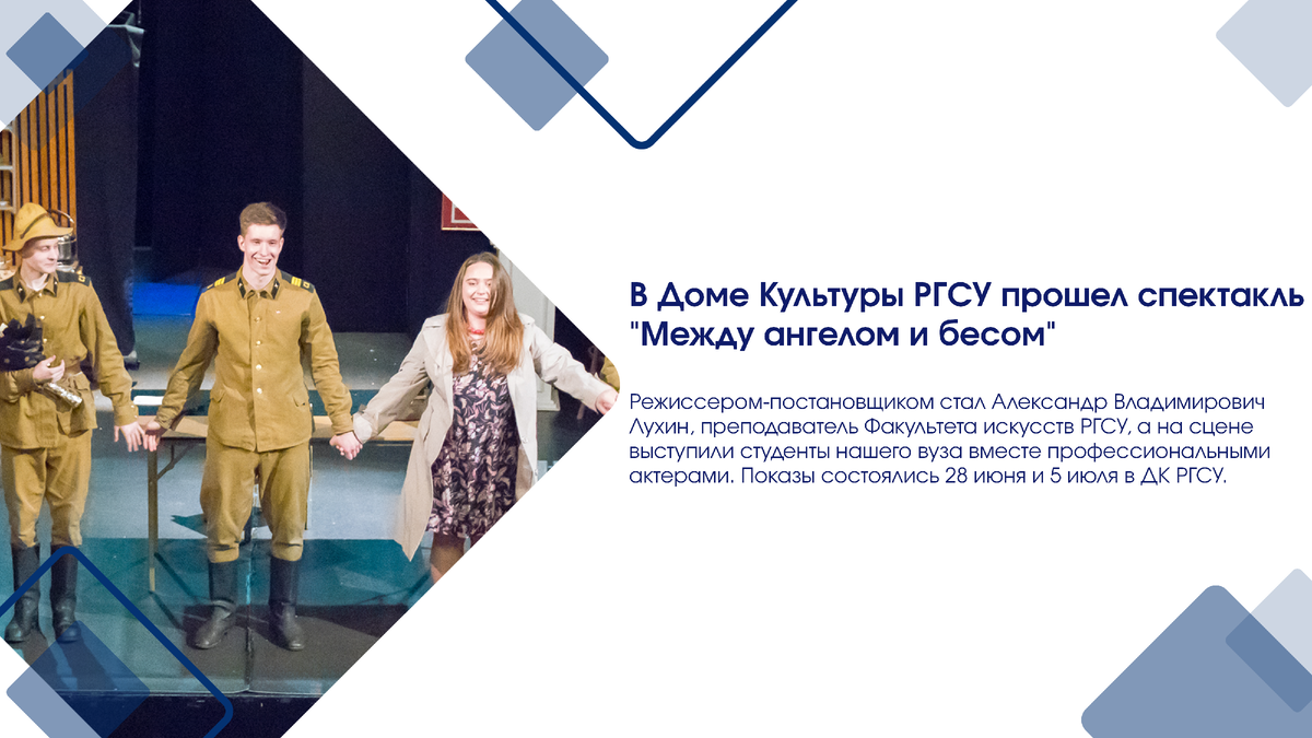 Режиссером-постановщиком стал Александр Владимирович Лухин, преподаватель Факультета искусств РГСУ, а на сцене выступили студенты нашего вуза вместе профессиональными актерами. Показы состоялись 28 июня и 5 июля в ДК РГСУ. Драматический спектакль «Между ангелом и бесом» был поставлен Александром Владимировичем Лухиным по пьесе Владимира Жеребцова «Чморик. Подсобное хозяйство». Режиссер рассказал о некоторых деталях постановки и о дальнейших планах в РГСУ: “В нашем университете на Факультете искусств учатся студенты по специальности "Актёр драматического театра и кино". В дополнение к профессиональной учебной программе был создан общеуниверситетский проект, в котором объединились студенты актёрского направления и студенты других факультетов, желающих дополнительно получать навыки в области актёрского мастерства. В течение этого учебного года проходили встречи с профессиональными актерами, педагогами по актерскому мастерству, проводились мастер-классы по сценическому движению, сценическо