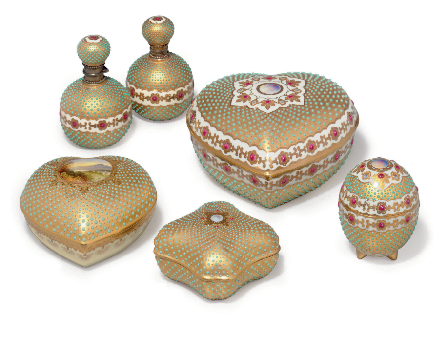 Фарфор под названием «Драгоценные камни» или «Ювелирное дело» — это изысканная керамическая техника, созданная путем наплавления капель цветной эмали на золотую и серебряную фольгу для создания замысловатого орнамента, имитирующего редкие драгоценные камни.
