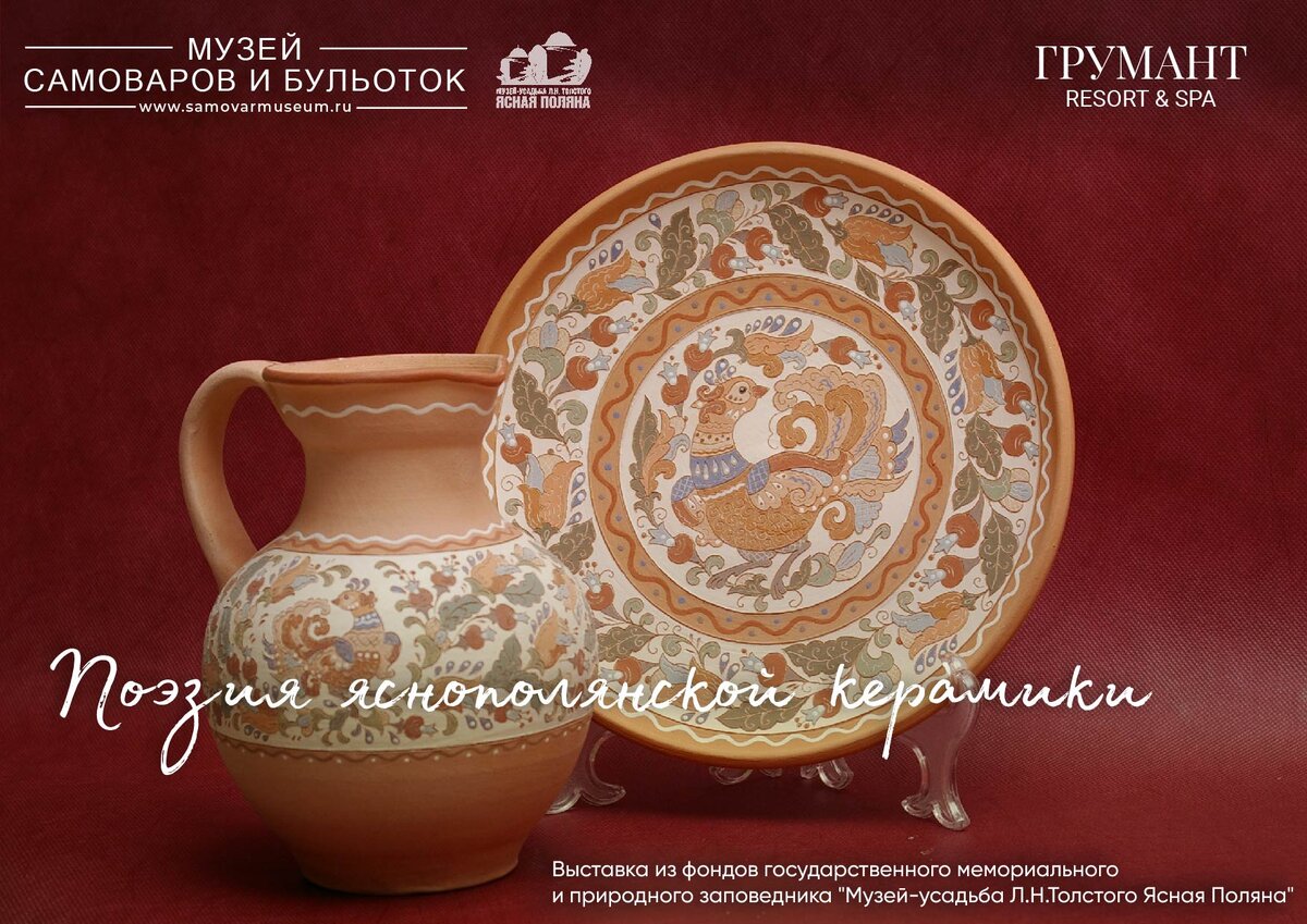 Выставка из фондов Государственного мемориального и природного заповедника «Музей-усадьба Л.Н. Толстого «Ясная Поляна». 4 июля 2023 года в музее самоваров и бульоток Грумант Resort& SPA открылась выставка керамических изделий яснополянских мастеров.