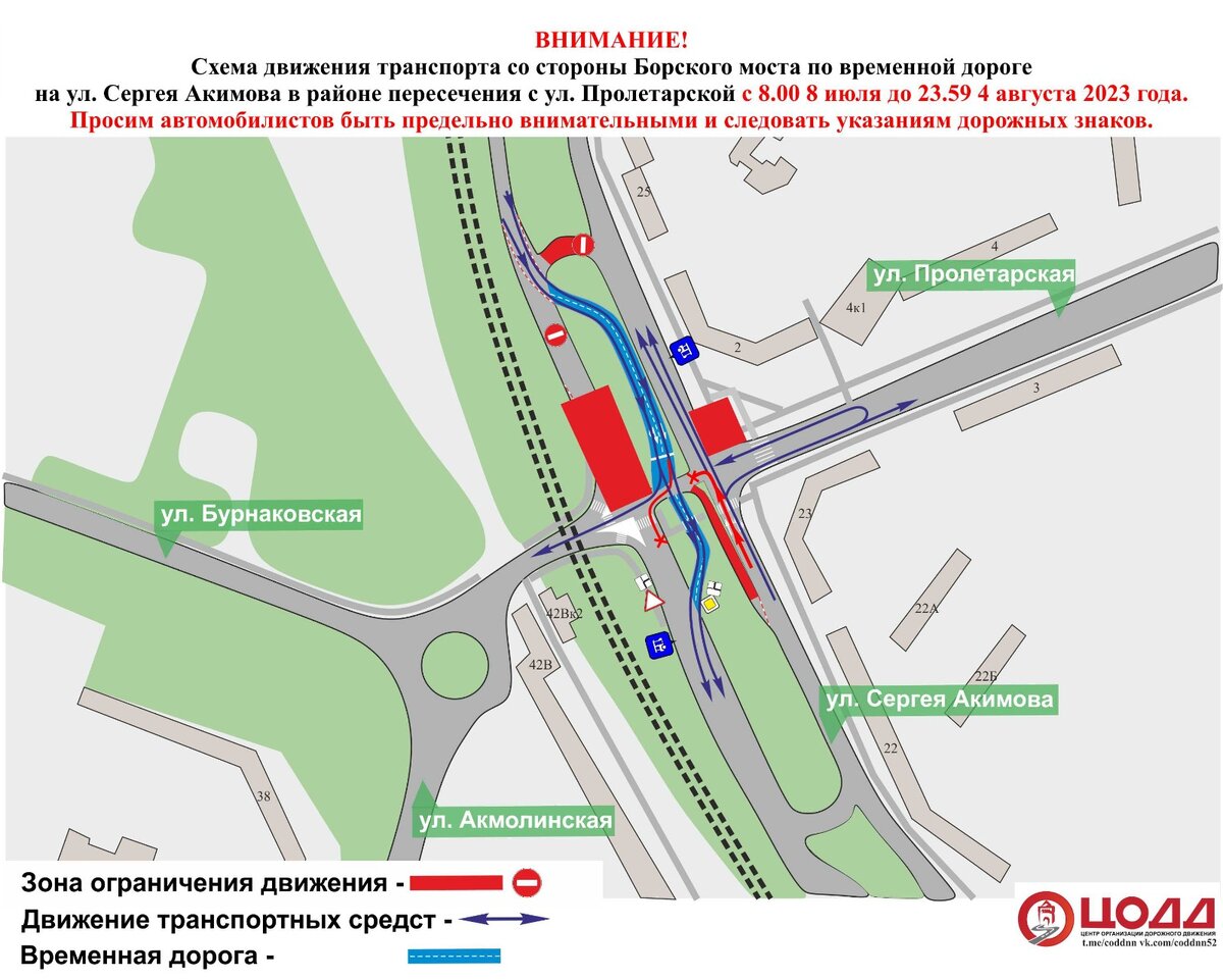 В Нижнем Новгороде с 8.00 8 июля по 4 августа изменят схему движения автотранспорта на улице Сергея Акимова. Об этом сообщает пресс-служба АО «Теплоэнерго». Изменения необходимы в связи с проведением второго этапа работ по замене магистральных теплосетей на перекрестке улиц Акимова и Пролетарской. Отмечается, что на съезде с Борского моста движение будет организовано по временной дороге, проложенной в газонной части. Движение по основной дороге со стороны съезда с Борского моста перекроют для проведения строительно-монтажных работ по перекладке трубопроводов под дорожным полотном. Временная двухполосная дорога в разделительном газоне между проезжими частями построена перед стартом работ, чтобы водители могли продолжать следовать привычным маршрутом в период проведения работ. Автомобилистов призывают быть внимательными и следовать указаниям дорожных знаков. Ширина проезжей части временной дороги позволяет организовать движение на участке в две полосы. Подробнее с информацией об организа