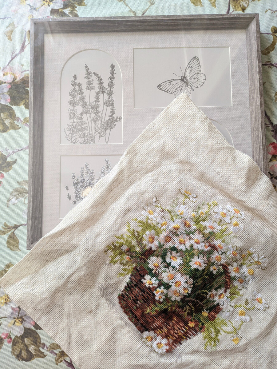 Наборы для вышивки я всегда покупаю с хорошей скидкой - просто жду скидку и всё 🤣. Когда работа приближается к концу, то встаёт вопрос - как оформлять, хранить... Идеальный вариант - это багетная мастерская. Но это для меня оооочень дорого. Единственная работа, которую я отдала на оформление профессионалам - Сливы - память о свекрови... Память мне обошлась больше 5 тысяч. Не, вру - ещё одна, которую я свекрови дарила - Домик на море. Её я тоже оформляла в мастерской. Но это было лет 15 назад и я не помню - сколько тогда заплатила... Готовых работ у меня, наверное, уже больше 15 штук. Что-то в дешёвых рамах на даче, остальные - в рулонах в шкафу. А как было бы хорошо, чтобы они были все в рамах и их можно было бы в зависимости от времени года и от настроения доставать и делать частью интерьера 🤗. Но, увы и ах... Для своих ромашек в Fixprace купила неплохую рамку: По размеру подошла: Но работу нужно, как минимум отпарить, чтобы было красиво: После долгой и кропотливой примерки ромашки