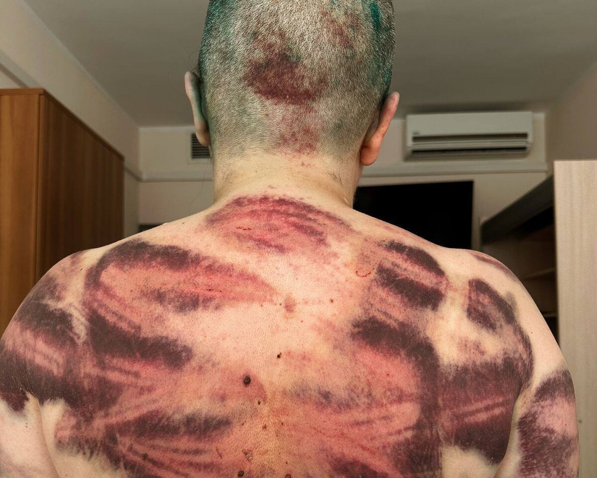Публикуется фото спины журналистки – там нет живого места от синяков и ссадаин. Милашина утверждает, что ее избивали полипропиленовыми трубами.